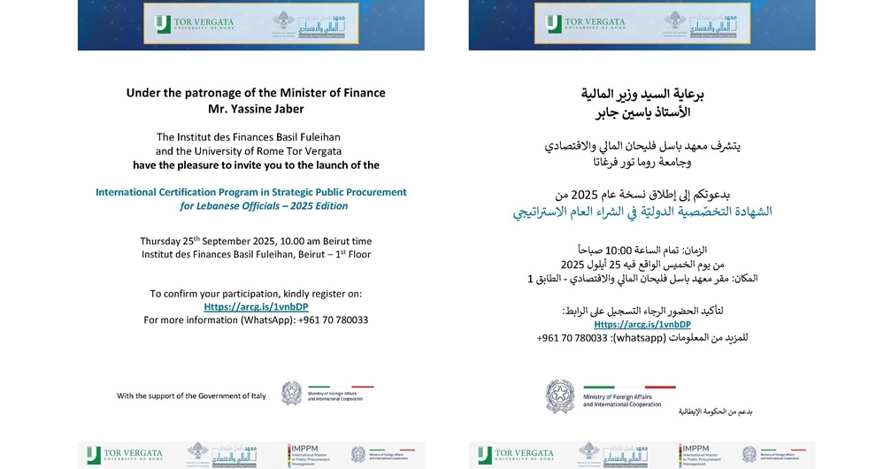 Under the patronage and in the presence of the Minister of Finance, Mr. Yassine Jaber, the Institut des Finances Basil Fuleihan and the University of Rome Tor Vergata have the pleasure to invite you to the launch of the 2025 Edition of the International Certification Program in Strategic Public Procurement for Lebanese Officials.