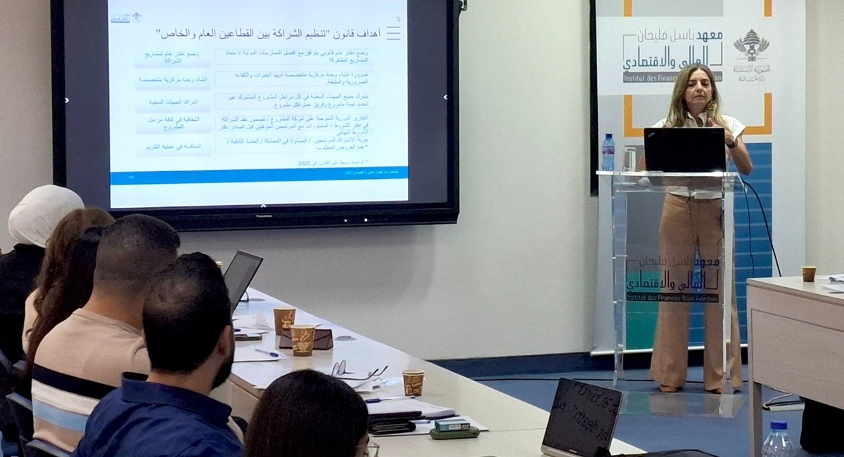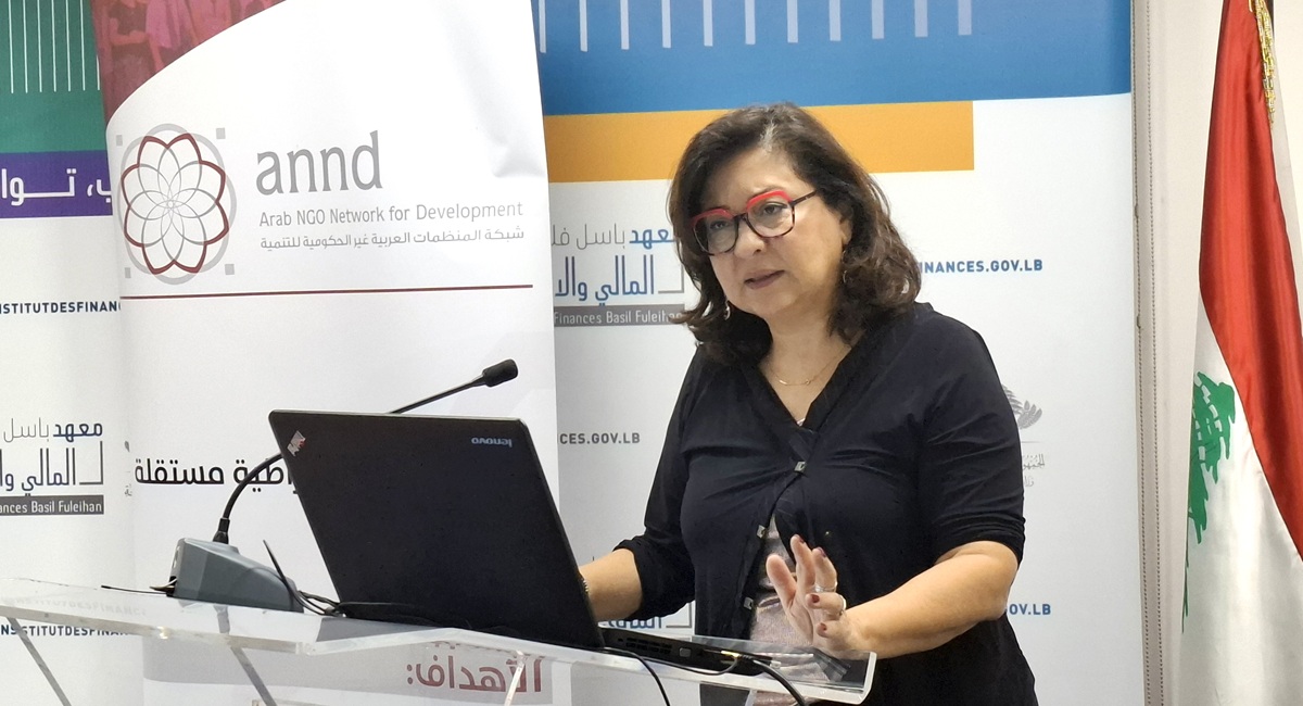 السيدة سابين حاتم، اقتصادية رئيسية ومديرة الراكات والتعاون في معهد باسل فليحان المالي والاقتصادي تعرض نتائج تقرير "مراجعة الإنفاق على الحماية الاجتماعية (2017-2024)" خلال حفل اطلاقه.. هذا التقرير هو ثمرة جهد مشترك بقيادة معهد باسل فليحان المالي والاقتصادي، بدعم فني من منظمة العمل الدولية واليونيسف وبتمويل مشترك من الاتحاد الأوروبي.