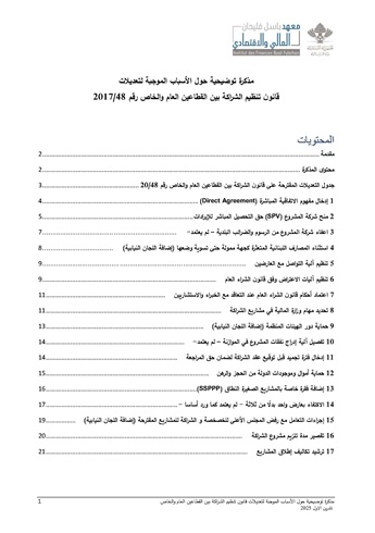 تهدف هذه المذكرة إلى توضيح دوافع التعديلات التي اقرّت على قانون تنظيم الشراكة بين القطاعين العام والخاص رقم 48/2017 في تشرين الأول 2025. وقد جاءت استجابة للتحديات التي برزت خلال تنفيذ بعض المشاريع وفق أحكام القانون قبل التعديل .