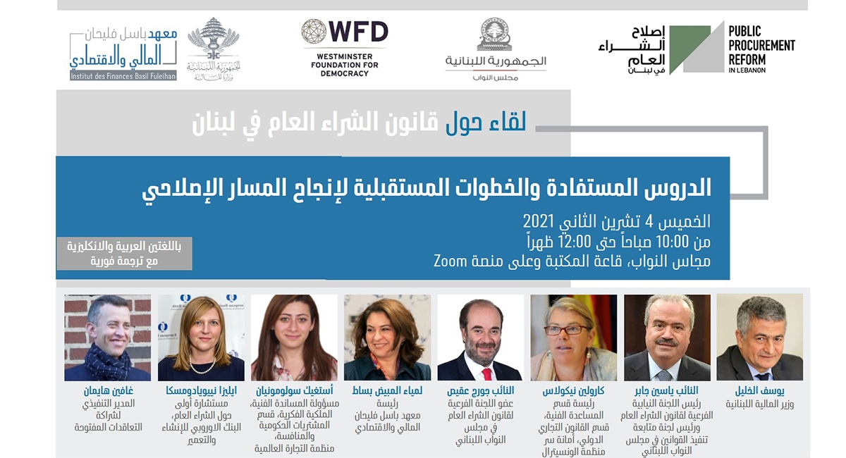 في إطار التحضيرات لدخول قانون الشراء العام 2021/244 حيّز التنفيذ في تموز 2022، نظّم مجلس النواب، بالتعاون مع معهد باسل فليحان المالي والاقتصادي ومؤسسة ويستمنستر للديمقراطية، هذا اللقاء بمشاركة صانعو السياسات والخبراء والجهات المعنية الرئيسية بتقدّم بإصلاح الشراء العام في لبنان، وممثلو المنظمات الدولية، بحيث تم إلقاء الضوء على متطلبات تطبيق نظام شراء عام فعال وتنافسي وشفاف، بما يتلاءم والمعايير الدولية، وأبرزها قانون الأونسيترال النموذجي، واتفاقية منظمة التجارة العالمية بشأن المشتريات الحكومية (WTO-GPA) وتوجيهات الاتحاد الأوروبي.